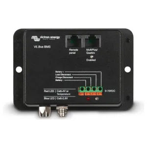 The VE.Bus BMS V2 is a Battery Management System (BMS) designed to interface with and protect a single, or multiple Victron Lithium Battery Smart 12,8V & 25,6V (LiFePO4 or LFP) in systems that have Victron inverters or inverter/chargers with VE.Bus communication. It monitors and protects the batteries against over voltage and under voltage of any individual cell, and also over temperature or under temperature conditions.
